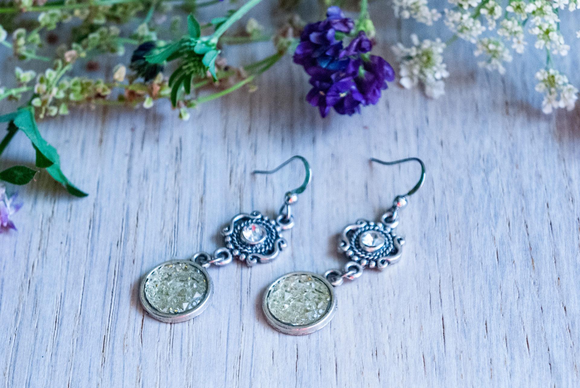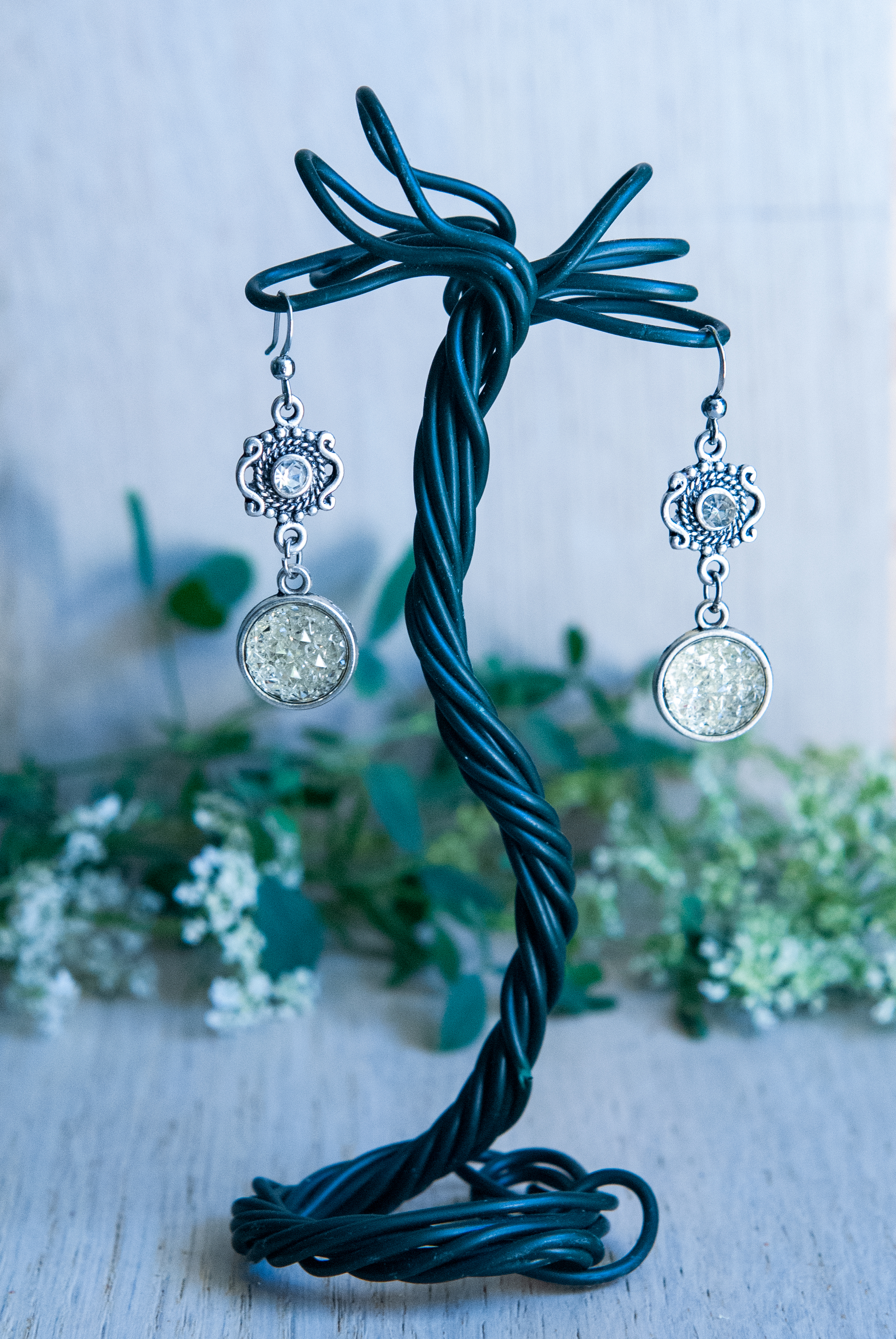 Eleganckie, wiszące kolczyki z druzami z barokowymi, misternie zdobionymi zawieszkami z niewielkim kryształkiem. Do koloru kryształka dobrano pasującą druzę – tu w wersji większej.